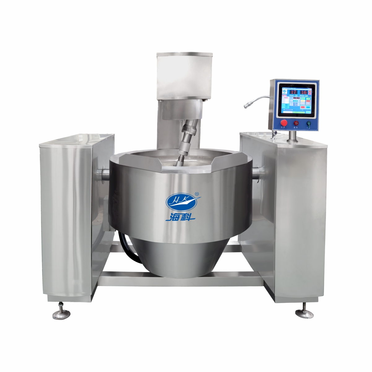 电磁摇锅采?电磁加热原理,具有微电脑控温技术、智能补温技术,采??星式刮底搅拌,不粘锅?搅拌死?,操作简便轻触按钮即可实现锅体翻转及搅拌。本机可?动精确控制温度、搅拌速度及加热时间,可解决在加热过程中各?艺参数依靠操作者经验来控制产品质量的问题,避免在加?过程中?为因素对产品质量产?的影响,提??艺可控性,保证产品质量。